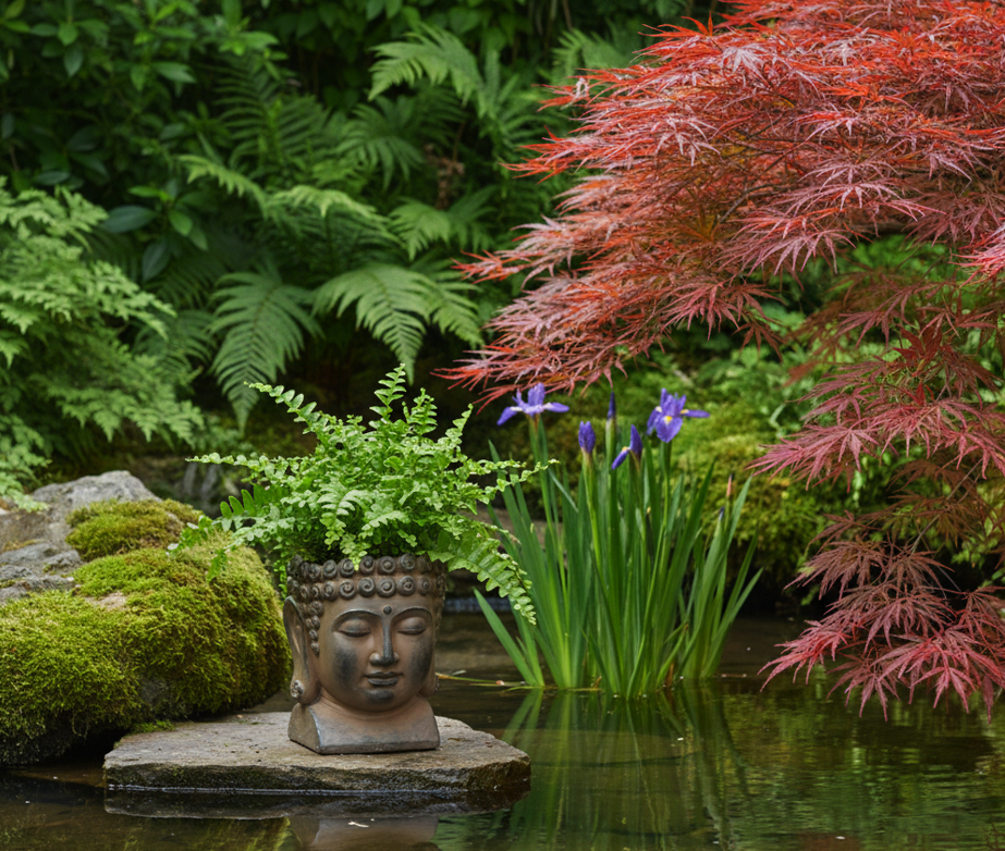 Den här ganska stora krukan i jordnära toner, ger ett lugn till platsen den står på. Skapa en rofylld och harmonisk liten oas med en egen 'Buddha'. Fint att kombinera med en vattenspegel, prydnadsgräs och flikiga blad av tex japansk lönn.